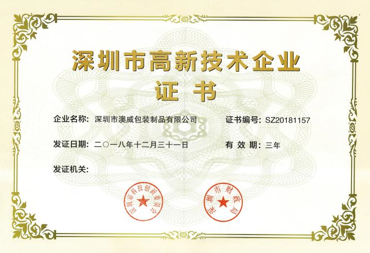 祝賀深圳市澳威包裝制品有限公司喜獲深圳市高新技術(shù)企業(yè)認(rèn)證
